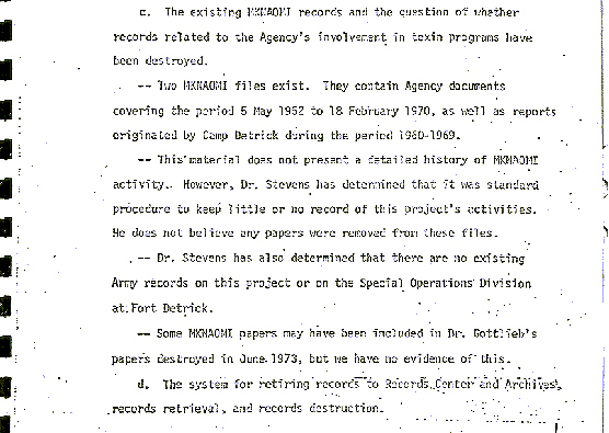 Именно там ще стане ясно, че Ричърд Никсън приключва MNAOMI през 1970 година Освен това излиза наяве, че доктор Гордън е приемал заповеди от доктор Сидни Готлиб, бъдещият шеф на MKULTRA. Готлиб даже разполагам с въпросния токсин от 5.9 грама – съвсем 3 пъти повече от формалните създадени от самото начало на плана. Според комитета, проекти за елиминирането на водачи с това оръжие е имало към персони като Фидел Кастро и Рафаел Тружило – деспот от Доминиканската република. Директор Уилям Колби е изпратен да свидетелства.