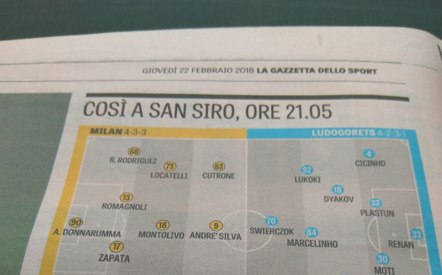 На безусловно същата единадесеторка на "росонерите " залага и изданието "Кориере каузи Сера ". То залага на съвсем същия състав и на Лудогорец, като единствената разлика с "Гадзета дело Спорт " е, че вместо Натанаел, на левия фланг на защитата е подложен Лукас Саша. Последният обаче е с контузия от мача със Славия.