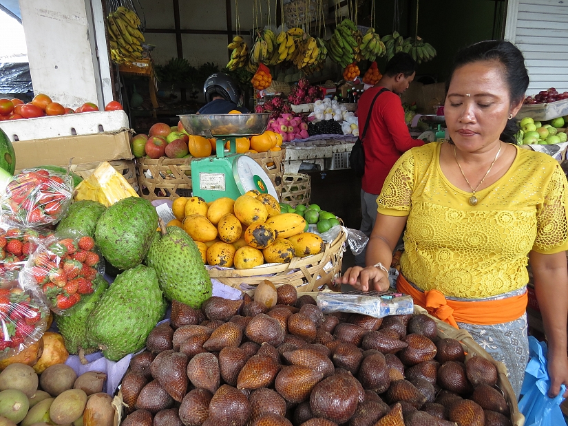 Пазар за плодове в Бали. Там се срещат екзотични плодове като мангостин, драконов плод, змийски плод, рамбутан