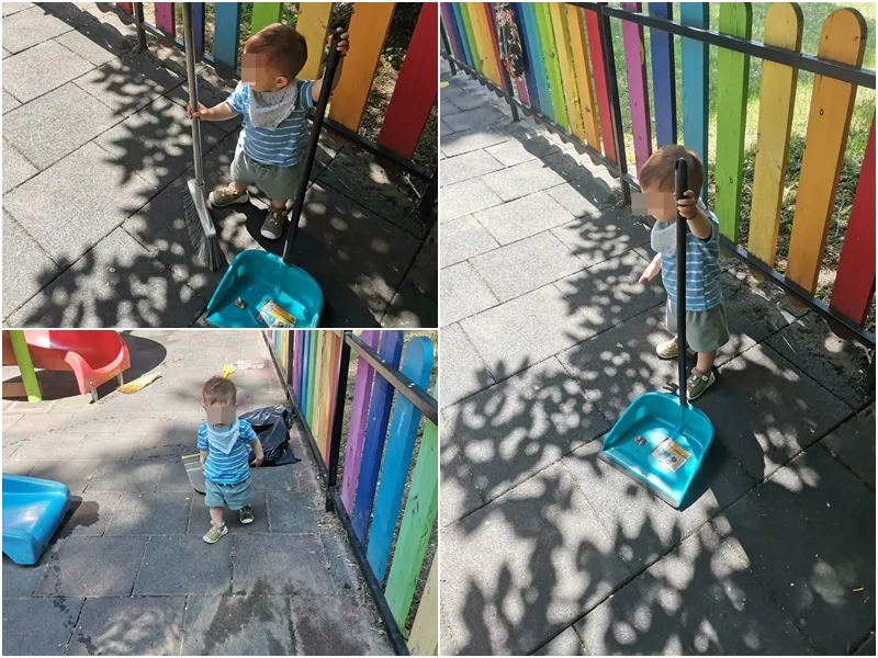 С метла и лопата в ръце, момченцето, едвам на 1 година и 2 месеца, се включва в почистването на мястото за игра, ситуирано на бул. „ Иван Вазов “, над детската ясла.