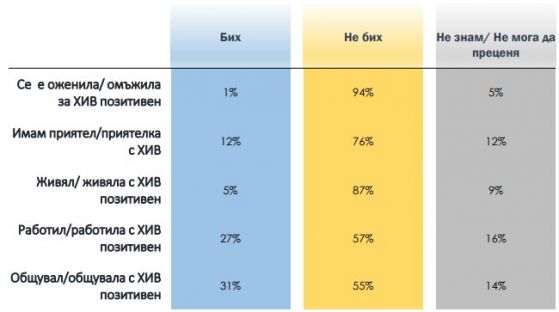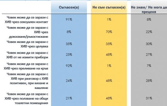 От проучването излиза наяве, че 92% от българите не познават човек, който е притежател на ХИВ. Само 6% от всички интервюирани пък са се чувствали изложени на риск от заразяване с ХИВ.