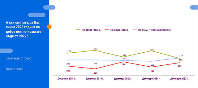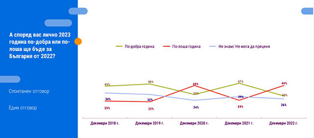 Очакванията за идващата 2023 година не са оптимистични. 44% считат, че България я чака една по-лоша година от 2022 година, а 30% чакат по-добра година.