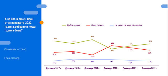 В персонален проект актуалната година е била добра за малко над половината българи (51%). Това е най-високата стойност от 2019 година насам.