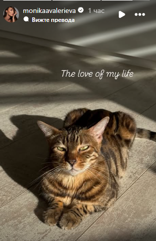 Едва час откакто показа в профила си нежния кадър с домашния си любим, Моника Валериева още веднъж съумя да разбуни мрежата. Под грейналите слънчеви лъчи плеймейтката сподели „ любовта на живота си “ - своята котка, която явно от дълго време е заела най-топлото място в дома й, видя Lupa.bg.