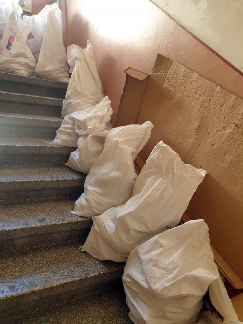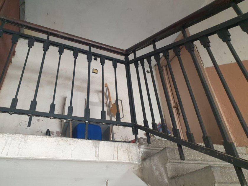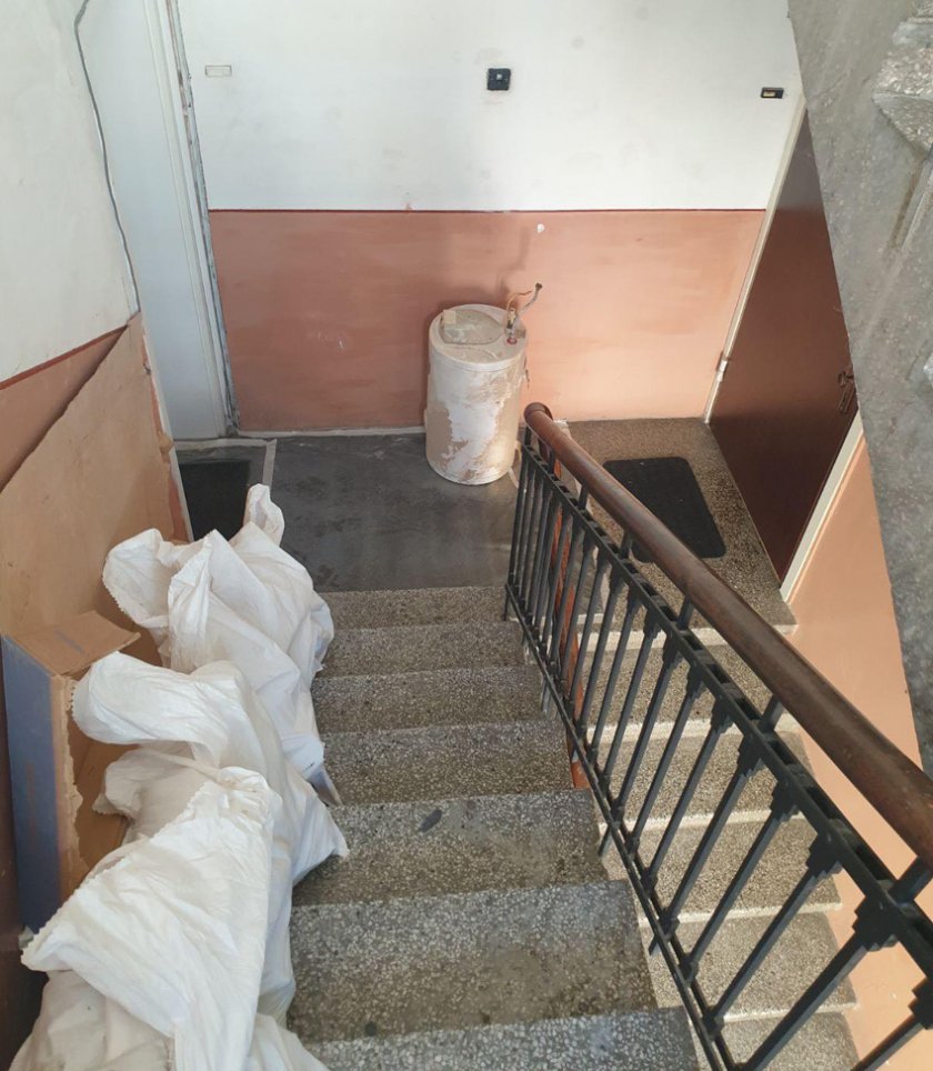 По стълбите във входа са струпани строителни материали.