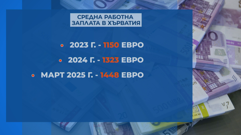 Хърватия е последната, която вкара единната европейска валута. За една година след влизането в еврозоната заплатите се покачват с 14% - от 1150 евро междинното заплащане се усилва на 1323 евро. През март тази година междинната месечна чиста заплата към този момент е 1448 евро, а брутната - 2014 евро.