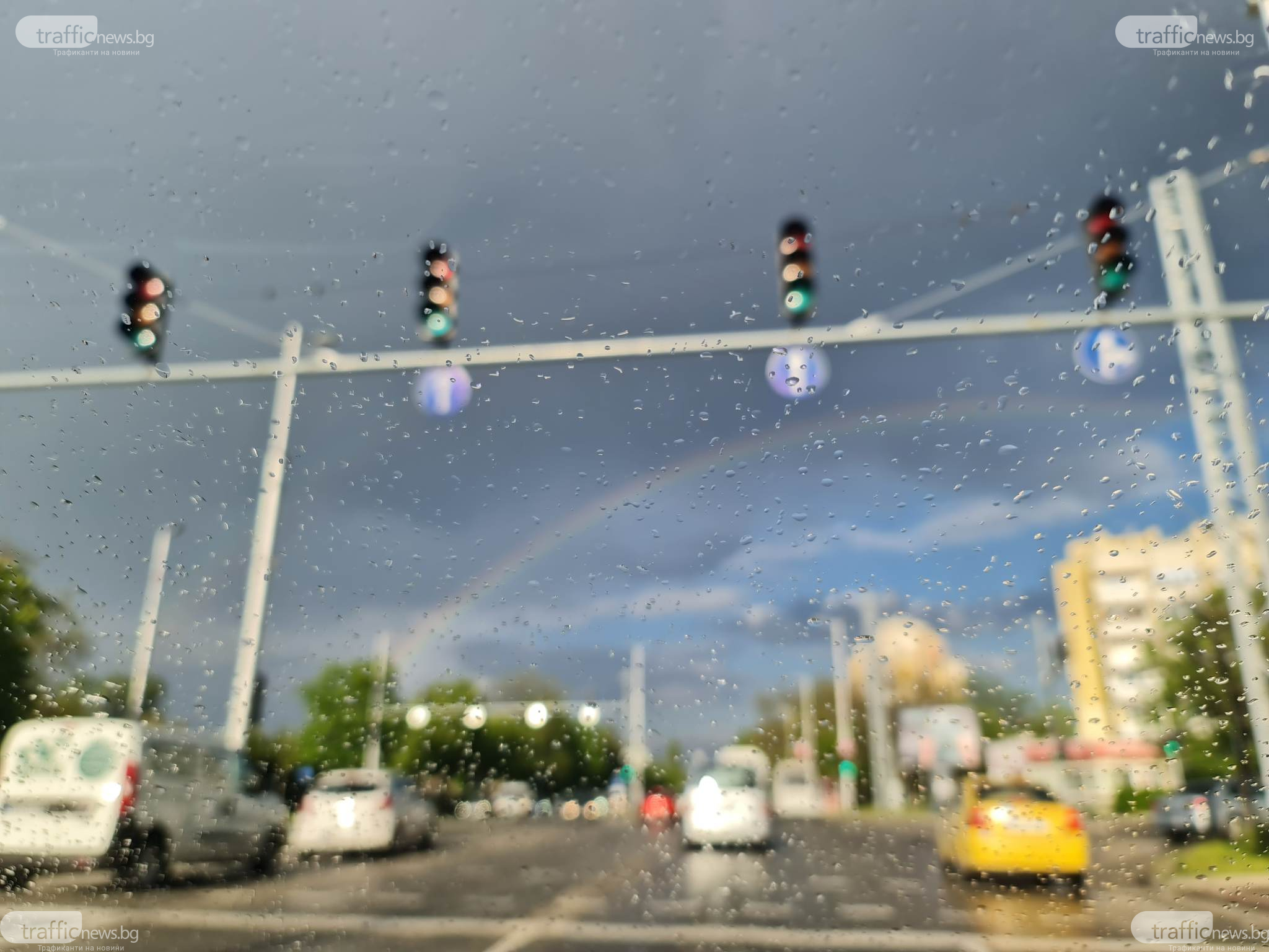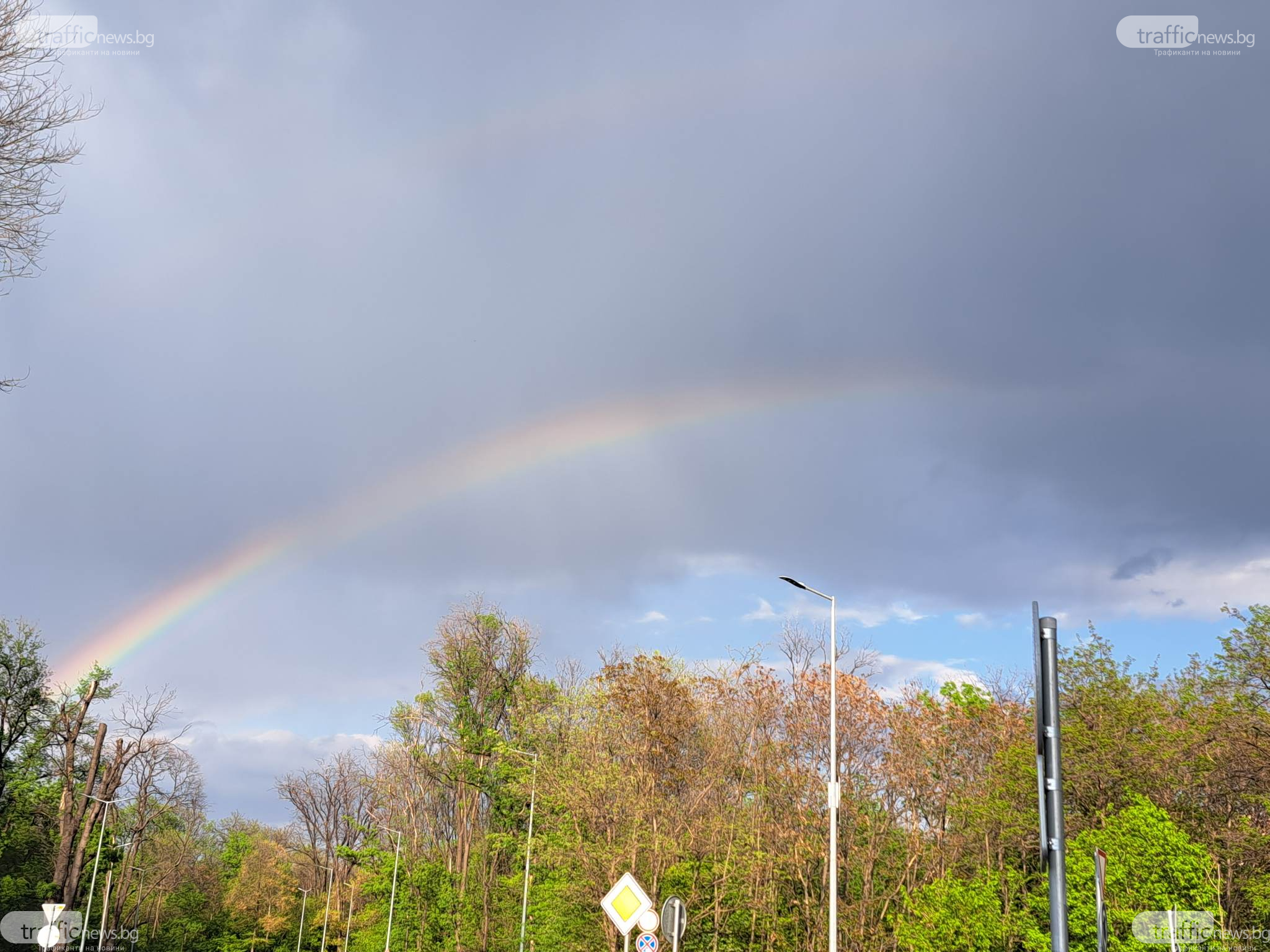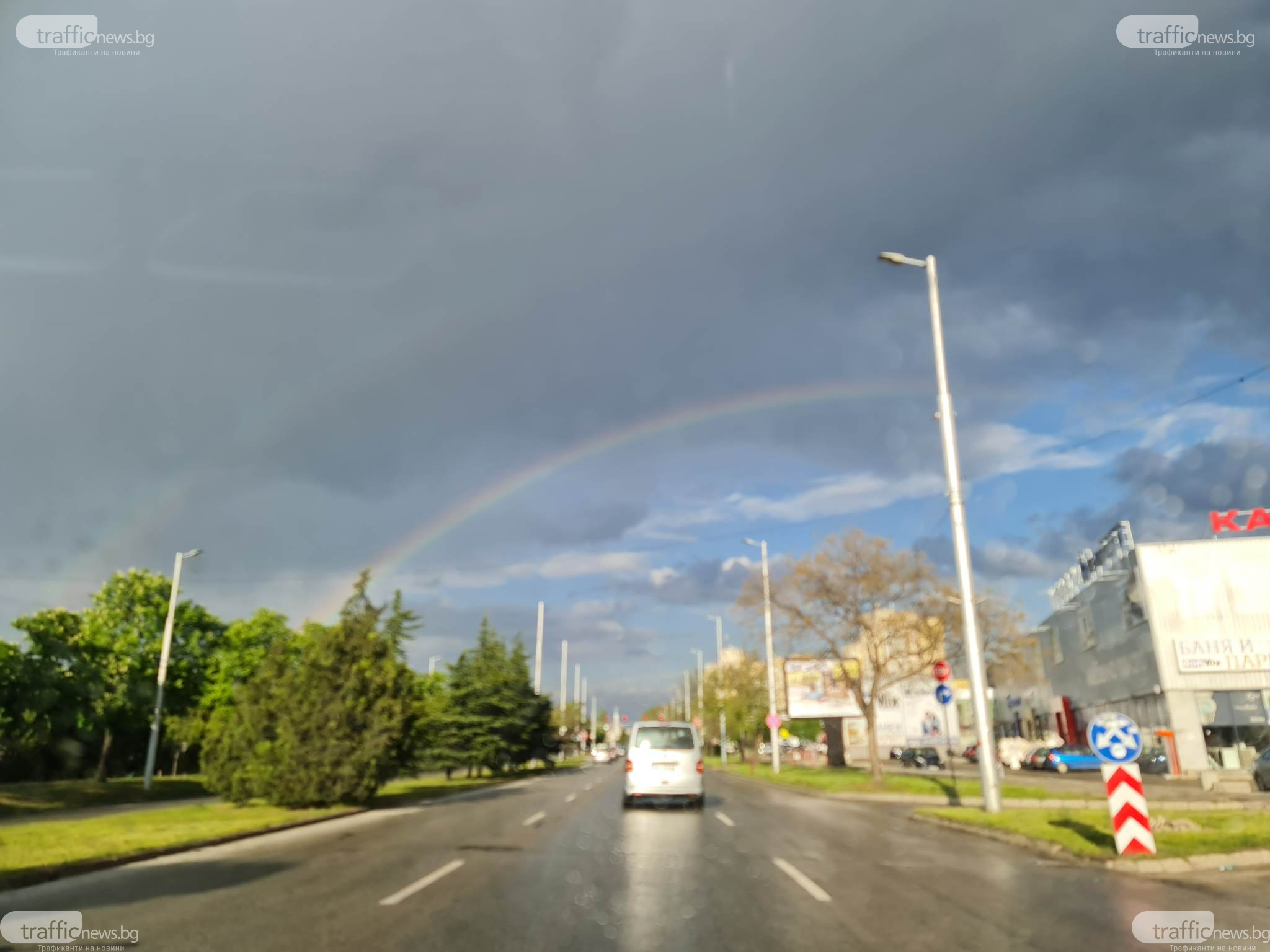 Ефектна дъга се появи след следващия пролетен дъжд в Пловдив. Ярка и осезаема, тя озари небето над града под тепетата.