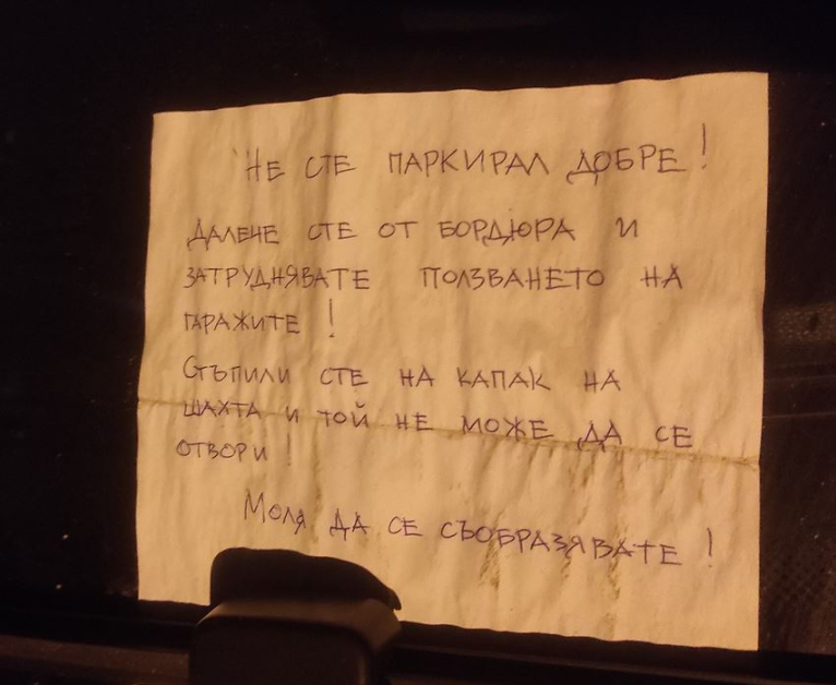 " Не сте паркирал добре! Далече сте от бордюра и затруднявате потреблението на гаражите! Стъпили сте на похлупак на шахта и той не може да се отвори! Моля да се съобразите! ", четем на белия лист. Редно е да отбележим, че в текста липсват нормалните за сходен вид тротоарни трудове закани, грозни прилагателни и незензурни изрази.