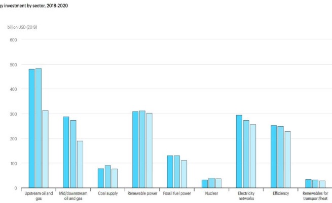 еждународната организация по енергетика (IEA) разгласява личната си прогноза за вложенията в бранша за 2020 година (на графиката виждате данните за 2018, 2019 и 2020 г.).