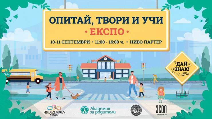 Ежедневните вести за стряскащи произшествия ни карат да се замислим какво може да направи всеки от нас, с цел да бъдем спокойни и сигурни в колите си. Екипът на Bulgaria Mall инициира акция #ДайЗнак! - УЧИЛИЩЕ ЗА БЕЗОПАСНОСТ НА ПЪТЯ, чиято цел е да запознае децата, посредством интерактивни уроци-игри с участниците в придвижването, пътните знаци и заплахите, които могат да се появят.На празника във връзка старта на образователната година – 15 септември, най-малките възпитаници ще схванат за какво е значимо да пресичат на пешеходни пътеки и на зелен светофар; за какво да не минават с колела и тротинетки през улицата, както и да се оглеждат преди да хукнат след топката. И за какво не трябва да играят на гоненица сред паркирали коли.Кампанията #ДайЗнак! - УЧИЛИЩЕ ЗА БЕЗОПАСНОСТ НА ПЪТЯ включва интензивности през всяка събота и неделя на септември. Още през първата седмица – 10 и 11 септември в партньорство с „ Академия за родители “ са проведени безвъзмездни работилници за деца. „ Опитай, Твори и Учи “ ЕКСПО има за цел за помогне на най-малките възпитаници да се ориентират в другите извънкласни действия, да опитат разнообразни неща и може би да открият своя гений. Освен групи по роботика, занимателна математика, изобразяване и направа на кукли и играчки, уредниците възнамеряват образователни игри за безвредно придвижването.