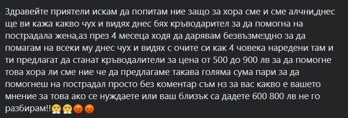 " Днес чух и видях с очите си по какъв начин 4 индивида, подредени там, ти оферират да станат кръводалители за цена от 500 до 900 лева ", написа той.