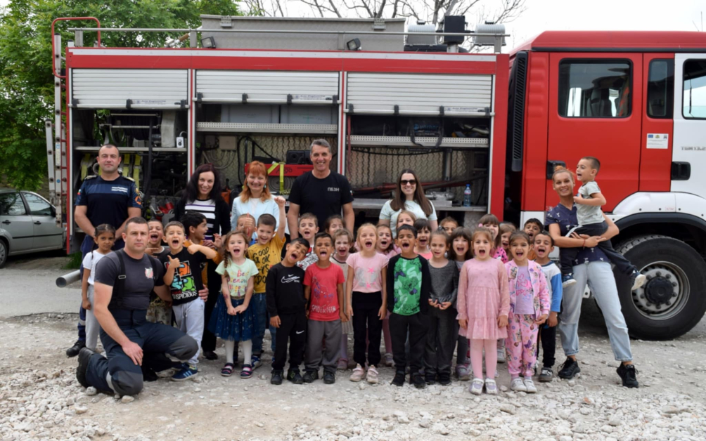 След това тримата пожарникари демонстрираха по какъв начин се гаси пожар. Малките огнеборци с неспокойствие чакаха да се включат. Първи се престрашиха децата от четвърта група, а след тях и останалите. „ Искам да стана пожарникар, тъй като ще избавям хора и ще изгасям пожари... “, показа едно от децата. „ Хареса ми пожарната кола... “, добави различен хлапак. След привършване на демонстрацията всички изпратиха с аплодисменти екипа на пожарната.