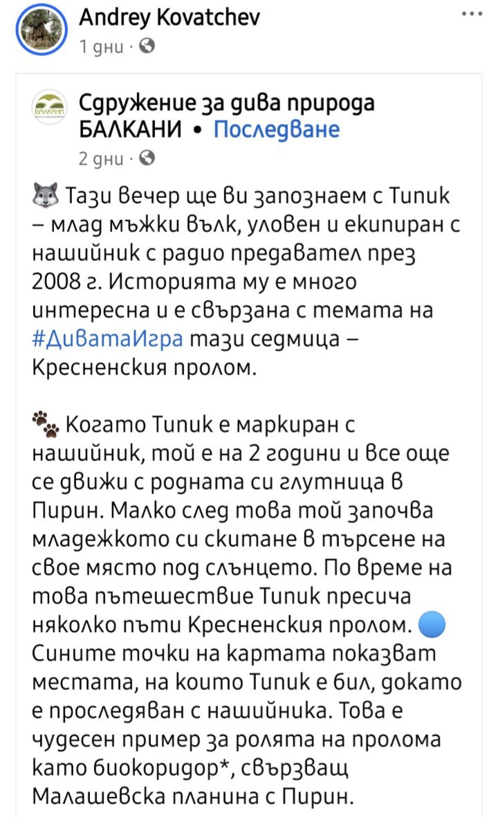 Според карта, оповестена от Андрей Ковачев, вълкът Типик непрестанно е пресичал Кресненското дефиле от Крупник, чак до Струмяни и Малашевската планина. Кога се е случило, какъв брой е правилно и какви доказателства имат, единствено еколозите знаят.