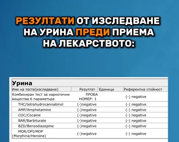 Екипът на Българска национална телевизия работи самичък. Тества обекта на опита преди приемането на медикамента с полеви тест за опиати и урина, която дава в лаборатория за тест за опиати.
