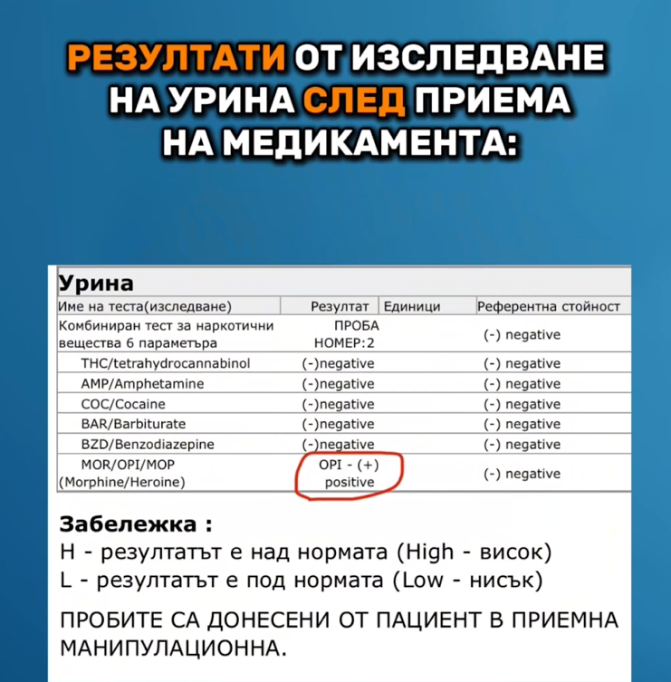„ Сега да забележим като си изпия хапчетата за глава какво ще стане “. 30 минути след приема лекарството водачът още веднъж дава в лаборатория урина за проучване за опиати. Лекарството за болежка се отпуска свободно без рецепта. От него могат да се вземат до 8 таблетки дневно. В листовката написа, че то не е проблем за шофирането, с изключение на, в случай че не се появи виене на свят.