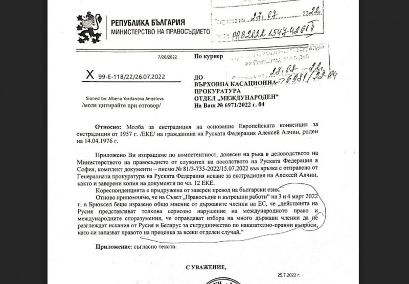 Проблемите на Алчин у нас стартират след началото на войната в Украйна, когато на митинг във Варна изгаря персоналните си документи. И по този начин доникъде на юни месец, когато Алчин е задържан в дома си у нас. Повече от месец прекарва под „ домакински арест “, а на 2 август беше арестуван за непрекъснато в ареста. Документите за екстрадацията му са импортирани " персонално, на ръка " от чиновник в съветското посолство, което се схваща от писмо на министерството на правораздаването до ВКП. В същото писмо се припомня, че има решение на Европейски Съюз, че защото Русия не съблюдава никакви интернационалните правила, може да не се почитат настояванията ѝ за екстрадация.