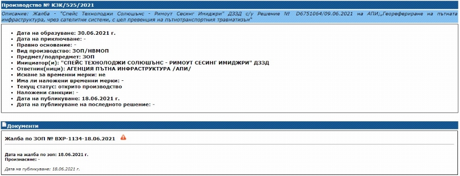 Екстравагантната с единствен поканен реализатор и планирана стойност съвсем 7,7 млн. лева без Данък добавена стойност е прекъсната от Агенция „ Пътна инфраструктура “ (АПИ) за повторно. Спирането ѝ обаче се апелира в Комисията за защита на конкуренцията от консорциума " СПЕЙС ТЕХНОЛОДЖИ СОЛЮШЪНС - РИМОУТ СЕСИНГ ИМИДЖРИ ". Образувано е и произвеждане по недоволството в Комисия за защита на конкуренцията.
