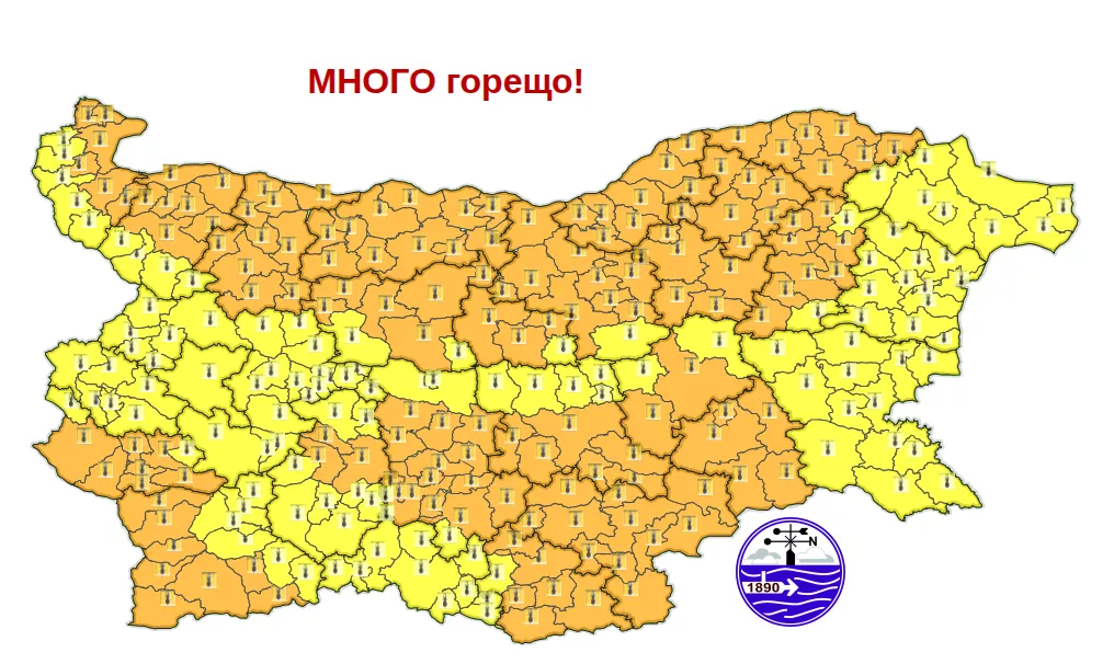 Националният институт по метеорология и хидрология (НИМХ) разгласи оранжев и жълт код за горещини у нас в общо 21 няколко области – в Северна, Централна и Южна България.