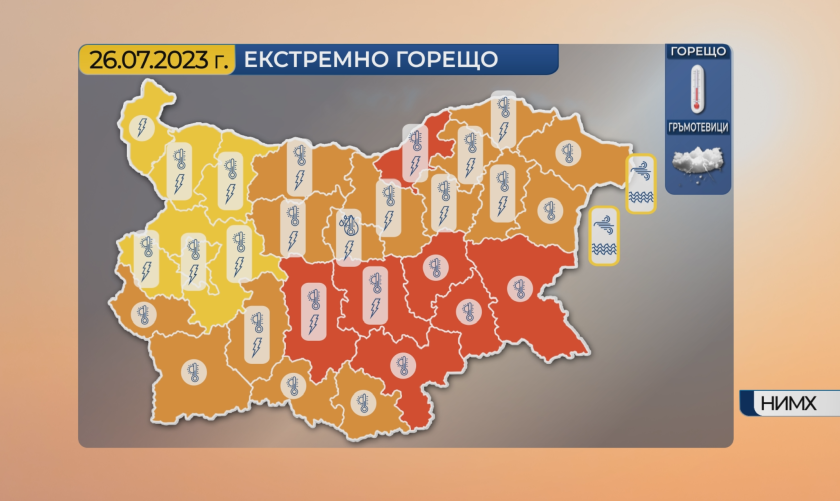 Екстремно горещото време в страната продължава. С увеличаване на южния вятър до сдържан, през днешния ден температурите още ще се покачат. Максималните ще са от 37° в регионите с разгласен код жълто, като София; към и над 40° в регионите в оранжево; до 42° в областите Плевен, В. Търново и Русе, където е мощ код алено.