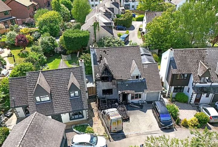 Снимки, направени след пожара, разкриват степента на разрушението – три изцяло унищожени автомобила, в това число ван, и мощно обгорял челен фасаден сектор на къщата.