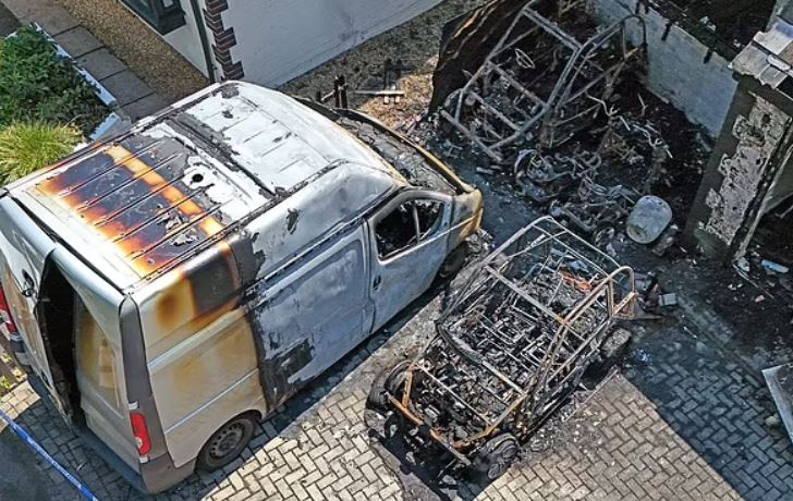 Всички транспортни средства на алеята, като се изключи вана, са сведени до овъглени остатъци. Не се оповестява какви са марките и моделите на колите.