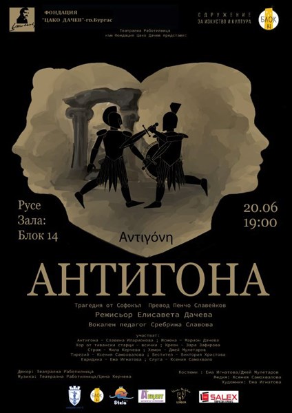 Трагедията от Софокъл „ Антигона " ще бъде показана на 20 юни в Русе от театралната работилница към Фондация „ Цако Дачев " в Бургас. Постановката ще стартира от 19:00 часа в Центъра за изкуство и просвета „ Блок 14 ", а входът за събитието е свободен.