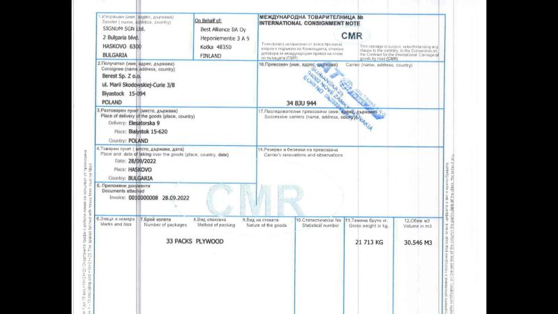 В тийзър към следствието, озаглавено " Контрабандистът на Путин ", изданието демонстрира клише на интернационална товарителница (CMR) за 22 тона дървесина, в която като спедитор е посочена компанията " Сайнъм Ес Джи Ен ", записана на бул. " България " 2 в Хасково, а адресат е полската " Берест " ООД в Бялисток. Справка на OFFNews в комерсиалния указател демонстрира, че името на Ернест Рошал не попада по никакъв метод в собствеността и ръководството на компанията. Неин притежател е българска гражданка и по последни данни, настоящи към 2017 година има единствено едно обезпечено лице в сдружението, а последният счетоводен доклад е от 2020 година. В различен документ, показан в следствието, " Сайнъм Ес Джи Ен " се води като формален вносител на дървения материал, а стоката е публично завършена като турски импорт.