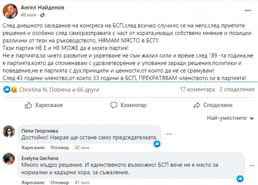 Емблемата на промените в Българска социалистическа партия от 90-те години, изявен натовец и дълготраен представител на партията Ангел Найденов я напуща след 33 години участие.