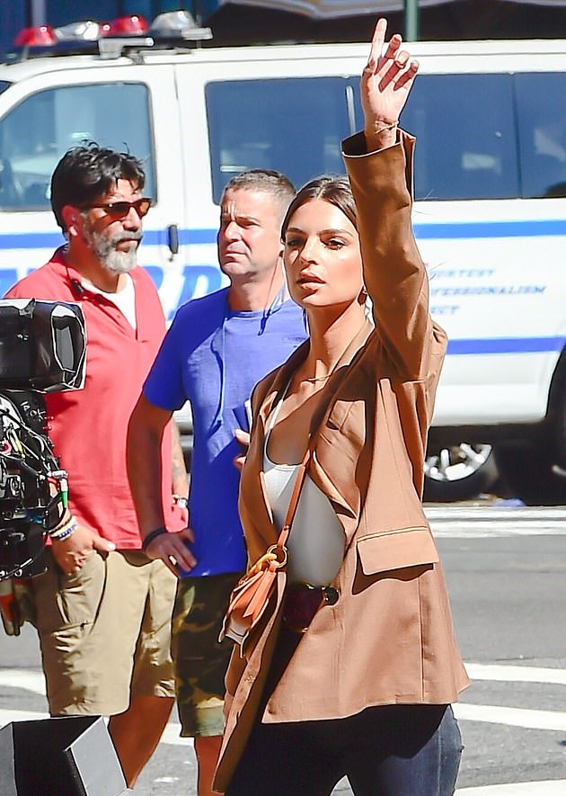 Емили заложи на пай чеп, топ, черно кожено сако и чифт бели ботуши на висок ток съчетани с бяла чанта. Като аксесоари тя добави черна шапка - вид барета, една огромна обеца и котешки слънчеви очила, които подчертаваха сексапила й. Под сакото се виждаше и сребърен колан, завит към талията й.