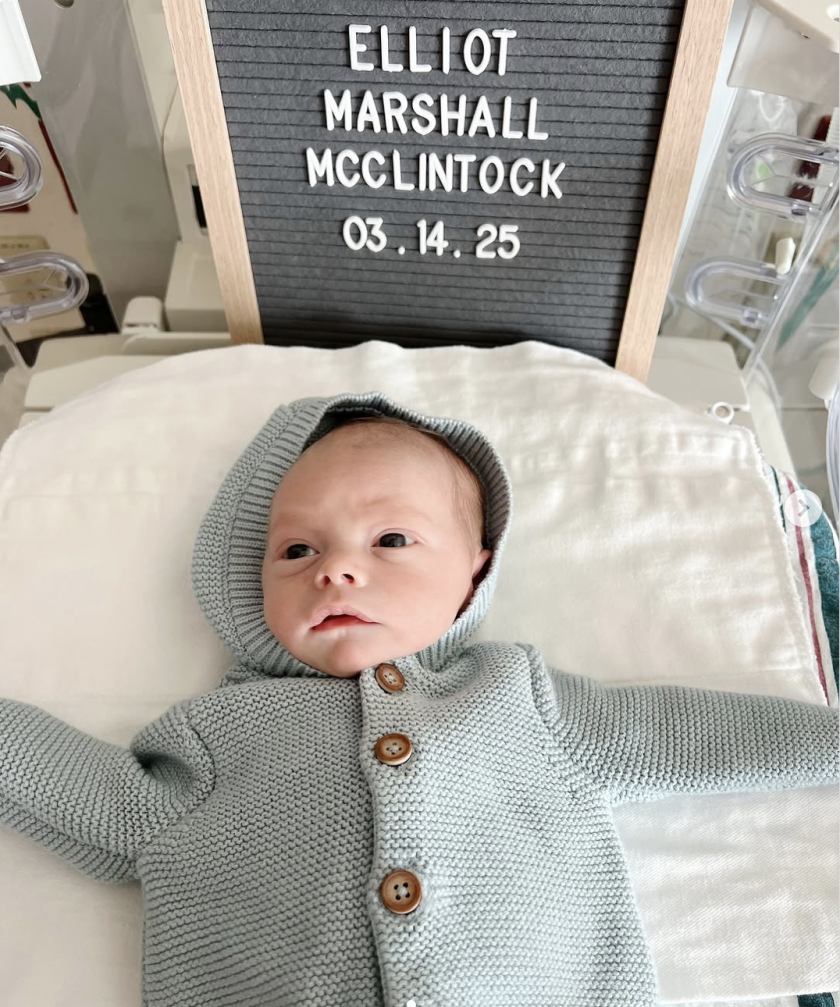 Тя разгласява първата фотография на бебето, облечено в светлосин суитшърт с качулка. Малкият Елиът театралничи пред табелка с надпис: „ Elliot Marshall McClintock 03.14.25 “, разкривайки, че неговото второ име – Маршал – е в чест на дядо му, чието същинско име е Маршал Матърс.