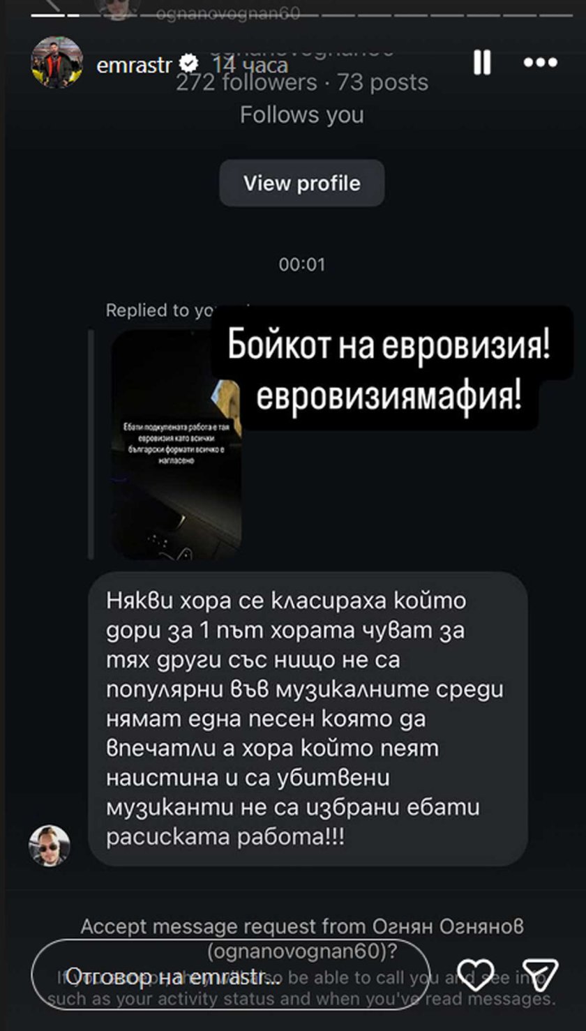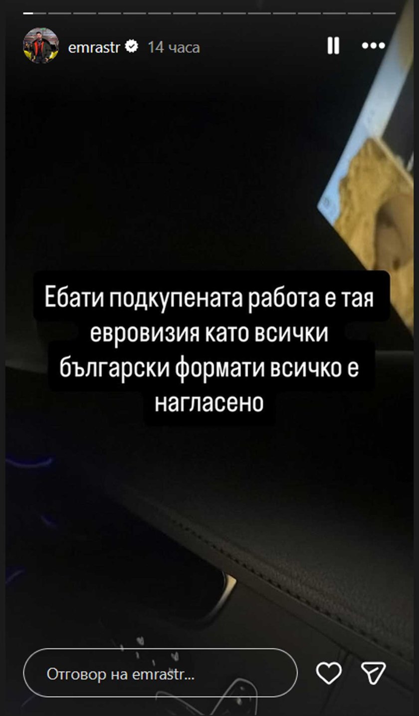 " Е*ати подкупената работа е тази " Евровизия ". Като всички български формати, всичко е нагласено ", избухна Емрах в профила си в Instagram в изявления, които към този момент са изтрити.