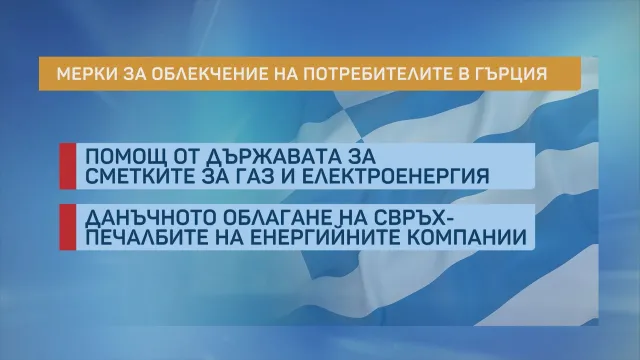 В Гърция държавното управление оказва помощ на най-уязвимите групи, като на 100% се компенсира скока в цената. Всеки, който понижи потреблението си с 15% получава и държавна помощ. Планира се и въвеждане на таван на цените на съществени артикули.