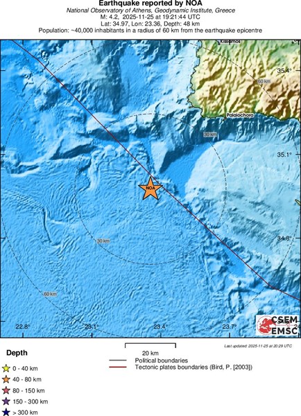 Обстановка на острова Към момента няма постъпила информация за нанесени материални вреди или потърпевши хора. Подобни земетресения са постоянно събитие в региона на Южна Гърция, защото там се намира дейна сеизмична зона. Дълбочината на днешното земетресение нормално понижава интензитета на чувство на повърхността, само че уголемява периметъра, в който то може да бъде усетено.