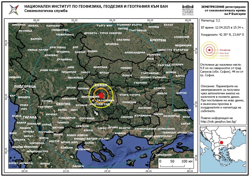 Сеизмичното събитие е записано в 15:34 часа българско време на 12 април 2025 година. Епицентърът на земетресението е локализиран на 15 километра от град Ихтиман и на 44 километра от град София.
