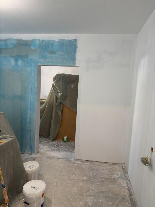 Първо минете стените с грунд (дълбоко проникващ е ок за естествена стена и за гипсокартон също). Можете и да го спестите, като вместо с грунд, боядисате първа ръка със мощно разводнен латекс - прави същата работа. След това не пестете латекса! Минавайте компактно, с положително количество на мечето. Не разнасяйте ненужно дълго и на тънички пластове, в случай че не желаете да минете 3-4 ръце.