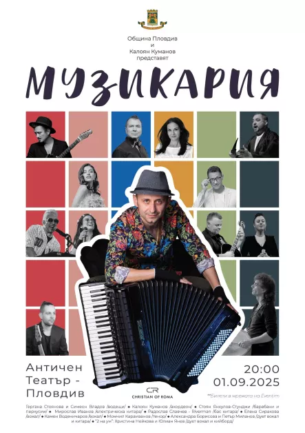 " Музикария " ще забавлява публиката с класика, рок-опера, фолклор, фънк, поп и рок части. В плана се включват актьорите Гергана Стоянова и Симеон Владов като водещи, Калоян Куманов (акордеон), Стоян Янкулов-Стунджи (барабани и перкусии), Мирослав Иванов (електрическа китара), Радослав Славчев-Riverman (бас китара), Елена Сиракова, Камен Воденичаров и Момчил Караиванов (вокали) и дуетите Александра Борисова-Петър Миланов и Христина Нейкова-Юлиан Янев.
