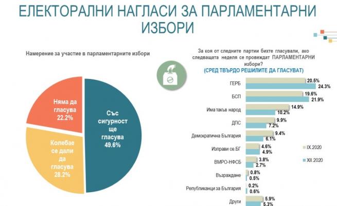 За ГЕРБ биха дали своят вот 24,3% от хората за Българска социалистическа партия - 21,9%, а "Има подобен народ " на Слави Трифонов излиза трета политическа мощ с 10,2 на 100 от гласовете на хората.