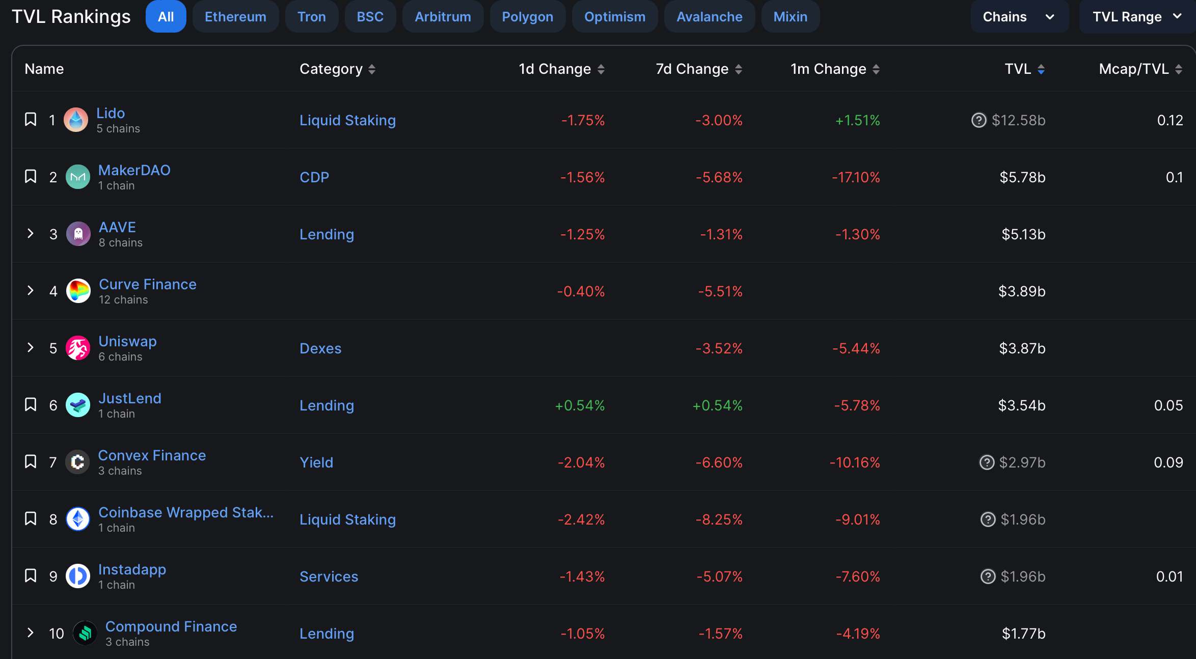 Сред плановете в границите на блокчейна на Етериум, Lido Finance резервира водеща позиция с TVL от $12.65 милиарда. Други планове, като MakerDAO, Curve Finance (CRV) и Aave (AAVE), ги следват, въпреки и с по-ниски стойности на TVL.