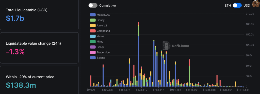 Като се имат поради падащите цени, DefiLlama разкри, че в случай че има още едно вкупом понижение на цената с 20%, от пазара може да бъдат източени още $161 милиона.