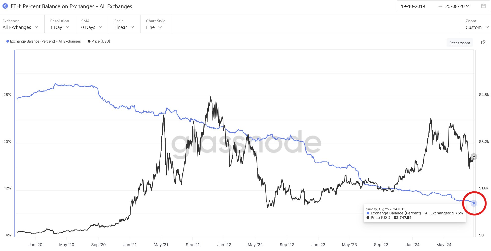 Според данни на Glassnode процентът на Етериум ( ETH ), съхраняван на централизирани тържища в международен мащаб, е понижен до исторически най-малко в края на август 2024 година, като на тези платформи се държат едвам 9.75% от ETH токените. Това е първият път от основаването на Етериум (ETH), когато по-малко от 10% от предлагането му се държи на централизирани тържища.