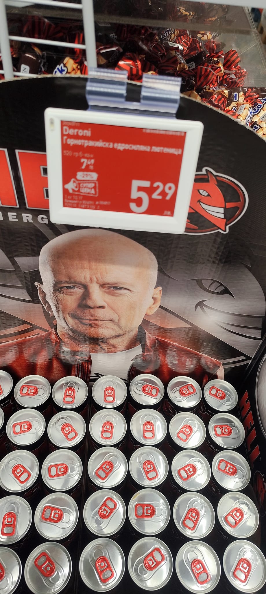 На фотографията се вижда, че евентуално са комплицирани етикетите и този за лютеницата " Дерони " е поставена над енергийните питиета с лика на Брус Уилис.