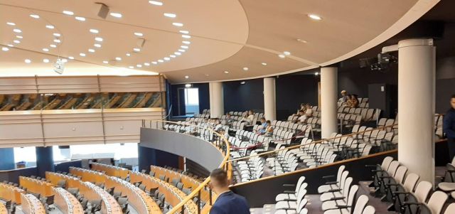 Разбира се, няма по какъв начин да пропуснем парламентарната зала. Над банките на евродепутатите са ситуирани местата за посетители.