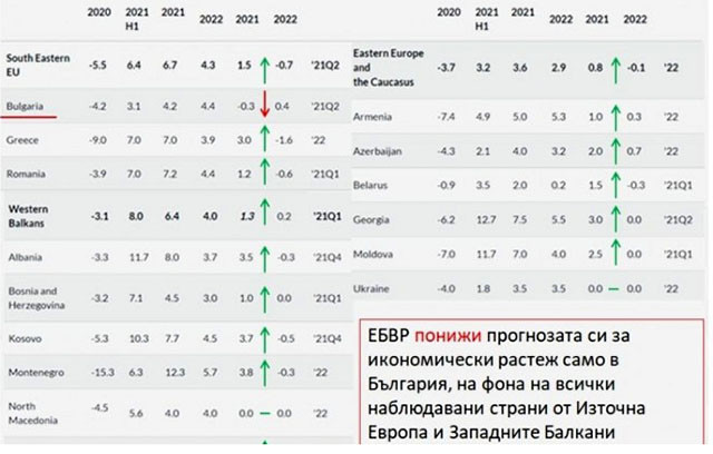 Ето каква оценка даде Европейска банка за възстановяване и развитие за протичащото в България през последните месеци: Единствената страна от Източна Европа, която получи слаба оценка от Европейска банка за възстановяване и развитие в интервала юни-ноември 2021 година е България. На 04.11.2021 година Европейска банка за възстановяване и развитие разгласява прогнозите си за всички 37 страни в района, които следи. Оказва се, че измежду всички страни от Югоизточна Европа, Източна Европа и Кавказ, както и нашите приятелски страни от Западните Балкани, единствено България е получила отрицателна оценка за протичащото се, като е намалена прогнозата за икономическия напредък на страната ни с 0,3 процентни пункта до 4,2%. ❗ Не единствено, че растежа, който предвижда финансовата институция в страната, е по-нисък от съседите ни в Румъния и Гърция, а освен това, прогнозата за нас се утежнява при доста усъвършенстване в нашите съседи. Гърция се чака да пораства с 7,0%, а Румъния с 7,2%, като по отношение на юни са получили усъвършенстване - надлежно с 3 и 1,2 процентни пункта. България е единствената страна от 15-те обсъждани от мен страни, попадащи в трите прилежащи района, която получава отрицателна оценка за протичащото се в интервала юни-ноември. Прогнозите за Русия и Турция, като наши съседи, също са с нараснали прогнози. В отчета си финансовата институция регистрира главните проблеми от миналите месеци, а точно ниските равнища на имунизация и продължаващата политическа рецесия. България е изведена и като страната с най-висока смъртност. Европейска банка за възстановяване и развитие е следващата финансова институция, която регистрира утежняване на макроикономическата прогноза за страната ни. За страдание на фона на 15+2 страни от прилежащи на нас райони, само България получи отрицателна оценка. Така протичащото се през последните месеци не остава неусетно и на интернационалната сцена. Припомням, че и във вътрешен проект към този момент имаше направено утежняване на макроикономическата прогноза за икономическия ни напредък от страна на Българска народна банка, като бяха изведени и някои от вътрешните ни проблеми: По-нисък размер на обществените вложения и отсрочване на осъществяването на финансирани с национални средства инфраструктурни планове за интервала след 2022 г.; По-слабо асимилиране през настоящата година на средства по стратегии на Европейски Съюз, свързани с финансови разноски, поради следеното закъснение в темпа на усвояване; Забавяне на частните вложения, заради обстоятелството, че част от тях е трябвало да се финансират със средства по Националния проект за възобновяване и устойчивост; Отрицателен принос към растежа на чистия износ. Наред с всичко това - общият индикатор на бизнес климата се утежнява от месец май, потокът на директни задгранични вложения понижава с 60% на годишна база. Цените на производител набъбнаха с 20% до тук и по-бавното им преместване към цените на крайните потребителски артикули ще стопи добавената стойност, надлежно в допълнение ще понижи евентуалния стопански напредък. Ето това ни донесе смяната през последните месеци. България единствена измежду страните в прилежащите райони получи отрицателна оценка.
