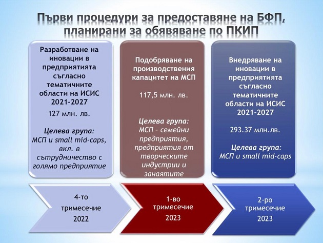 Европейската комисия утвърди новата Програма „ Конкурентоспособност и нововъведения в предприятията “ 2021-2027 (ПКИП). Бюджетът ѝ е близо 3 милиарда лева Тя е продължение на Оперативна стратегия „ Иновации и конкурентоспособност “ 2014-2020 (ОПИК) и ще се извършва от Министерството на нововъведенията и растежа.Очаква се осъществяването на програмата да започва още до края на тази година. Първата процедура по ПКИП ще е с бюджет 127 млн. лева и ще е ориентирана към микро-, дребните и междинни компании от разнообразни браншове на стопанската система. Тя е за създаване на нововъведения в предприятията.Следващата процедура, която се чака при започване на 2023 година, е в размер на 117.5 млн. лева за възстановяване на индустриалния потенциал на МСП, фамилни предприятия, предприятия от креативните промишлености и занаятите.След нея следва и процедура за внедряване на нововъведения в МСП за близо 300 млн. лева