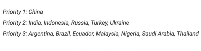 Въпреки че Европа е в челните редици на използването на ограничения за блокиране на уеб сайтове, отчетът разпознава тринадесет предпочитани страни с незадоволителна отбрана на авторските права, в това число Китай, Индия, Индонезия, Русия, Турция, Украйна, Аржентина, Бразилия, Еквадор, Малайзия, Нигерия, Саудитска Арабия и Тайланд.