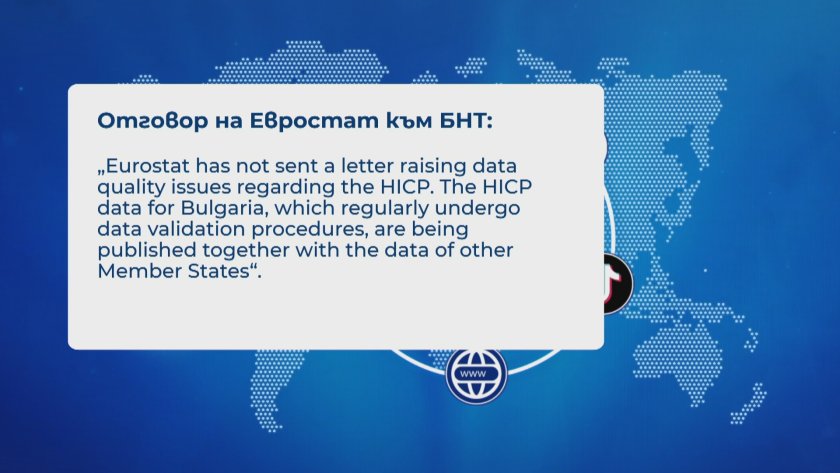 " Евростат не е изпратил писмо, повдигащо проблеми с качеството на данните във връзка с хармонизирания показател на потребителските цени. Данните за ХИПЦ за България, които постоянно минават процедури за валидиране на данни, се разгласяват дружно с данните на други страни членки ".