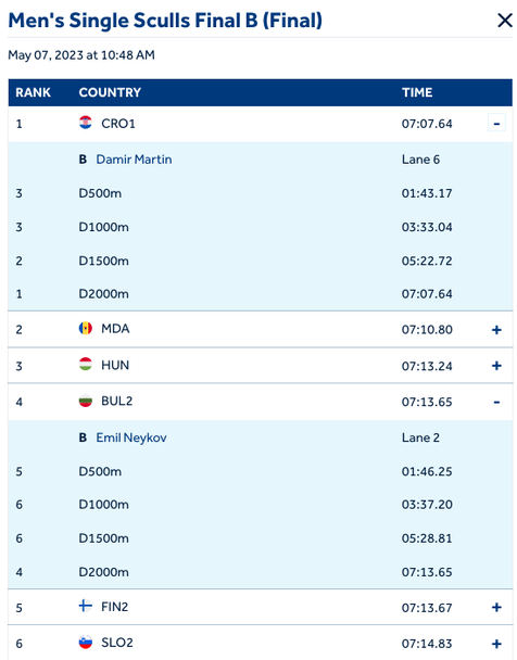 Победител във край Б стана олимпийският вицешампион на скиф от Рио 2016 и бронзов медалист от Токио 2020 Дамир Мартин от Хърватия с 7:07.64 минути.