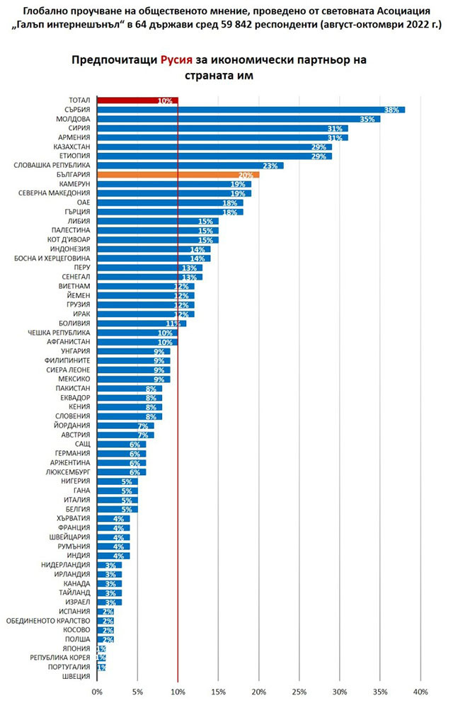 Русия се подрежда на второ място измежду желанията на българите за партньорска сила - надлежно с 20% за стопанската система и 24% за сигурността. Китай получава утвърждение от българите като сътрудник в областта на стопанската система в 11% от отговорите, а Съединени американски щати - в 9% от отговорите. 12% у нас одобряват като сътрудник в сигурността Съединени американски щати, а Китай - 3%.