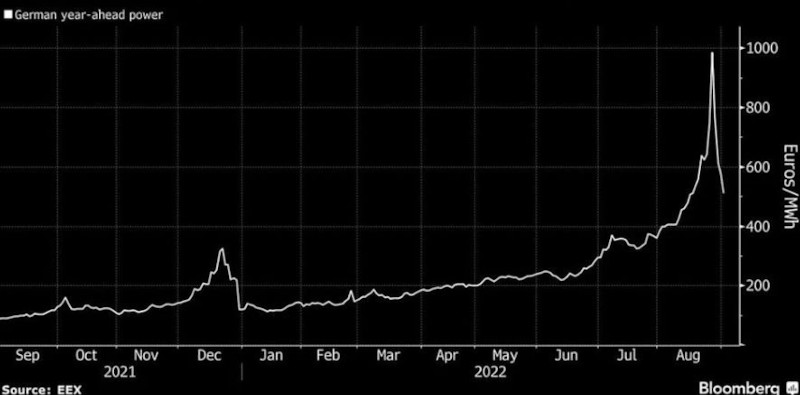 Германският контракт за година напред на енергийната борса ЕЕХ падна в четвъртък до 486 евро за MWh, откакто при започване на седмица удари рекорден връх над 1000 евро. Въпреки това намаляване настоящата цена към момента е към 10 пъти над сезонно-осреднената за последното десетилетие.
