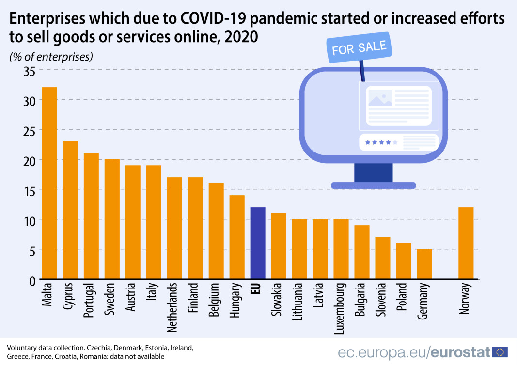 Сред страните членки на Европейски Съюз най-голям дял на предприятията, почнали или нараснали напъните си за продажба на техните артикули онлайн заради пандемията през 2020 година, е регистриран в Малта (скок с 32%), следвана от Кипър (с 23%) и Португалия (с 21%).